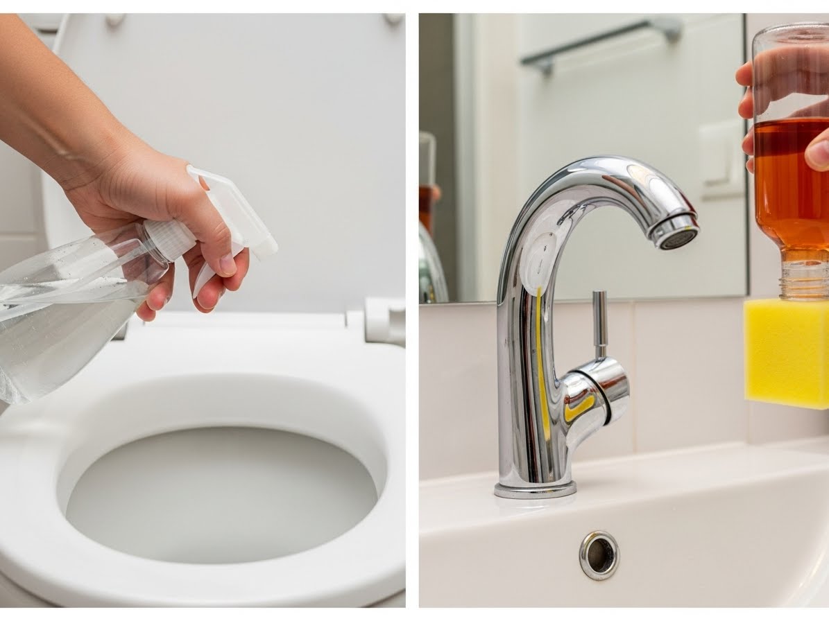 Diluye el vinagre blanco en una botella rociadora con agua en una proporción de 1: 1. Rocía la mezcla sobre las superficies del baño, como el lavabo, la encimera, el inodoro y la ducha. Deja actuar durante 5-10 minutos y luego limpia con un trapo de microfibra.